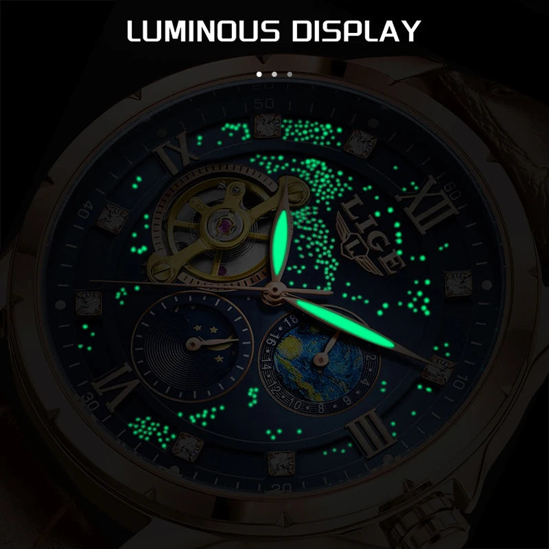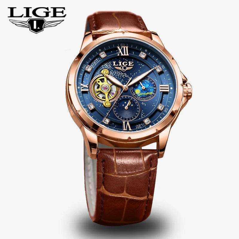 De LIGE 6830 is een luxe mechanisch herenhorloge met een opvallend tourbillon-ontwerp, maanfase-indicator en uitgesneden skeleton-details. Dit stijlvolle horloge combineert elegantie, precisie en functionaliteit in één verfijnde tijdmeter.