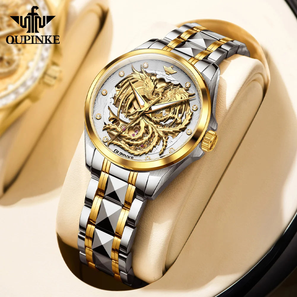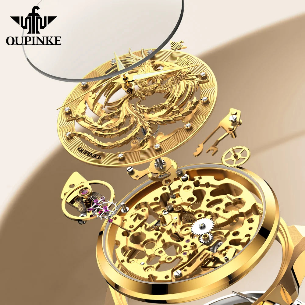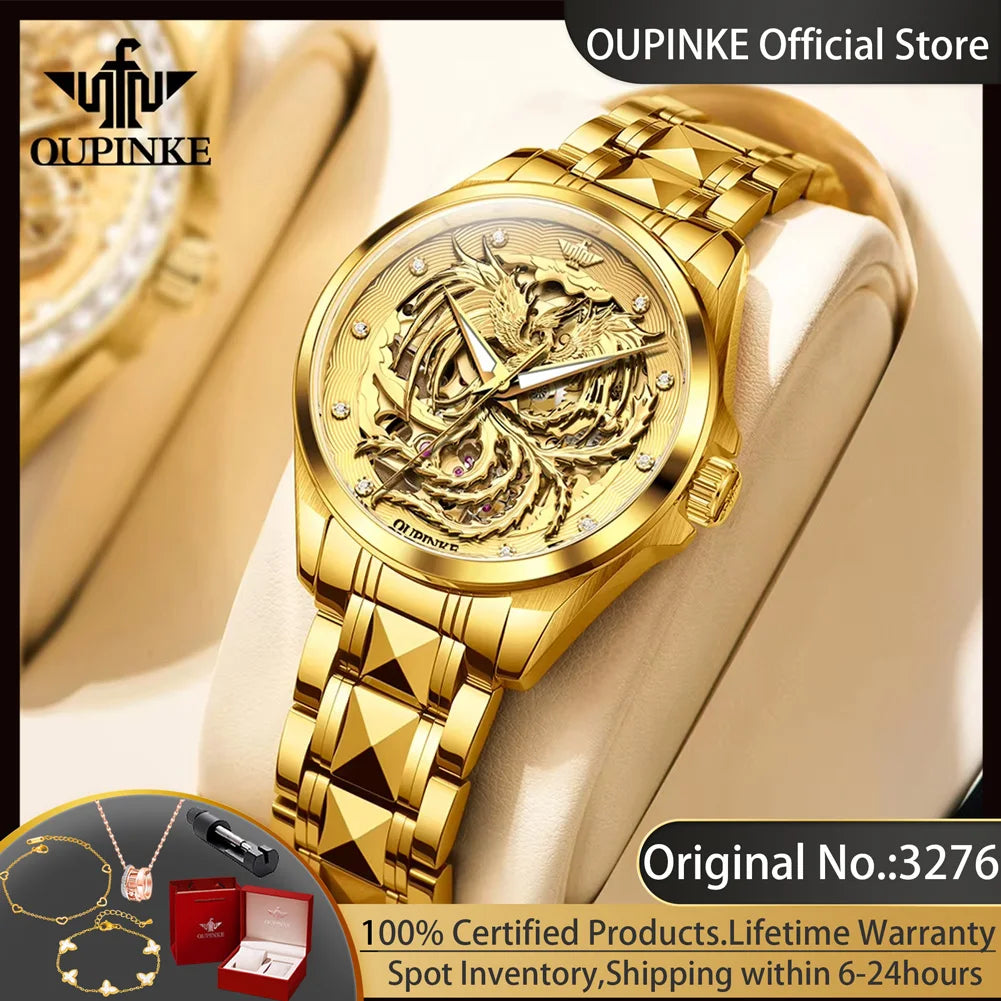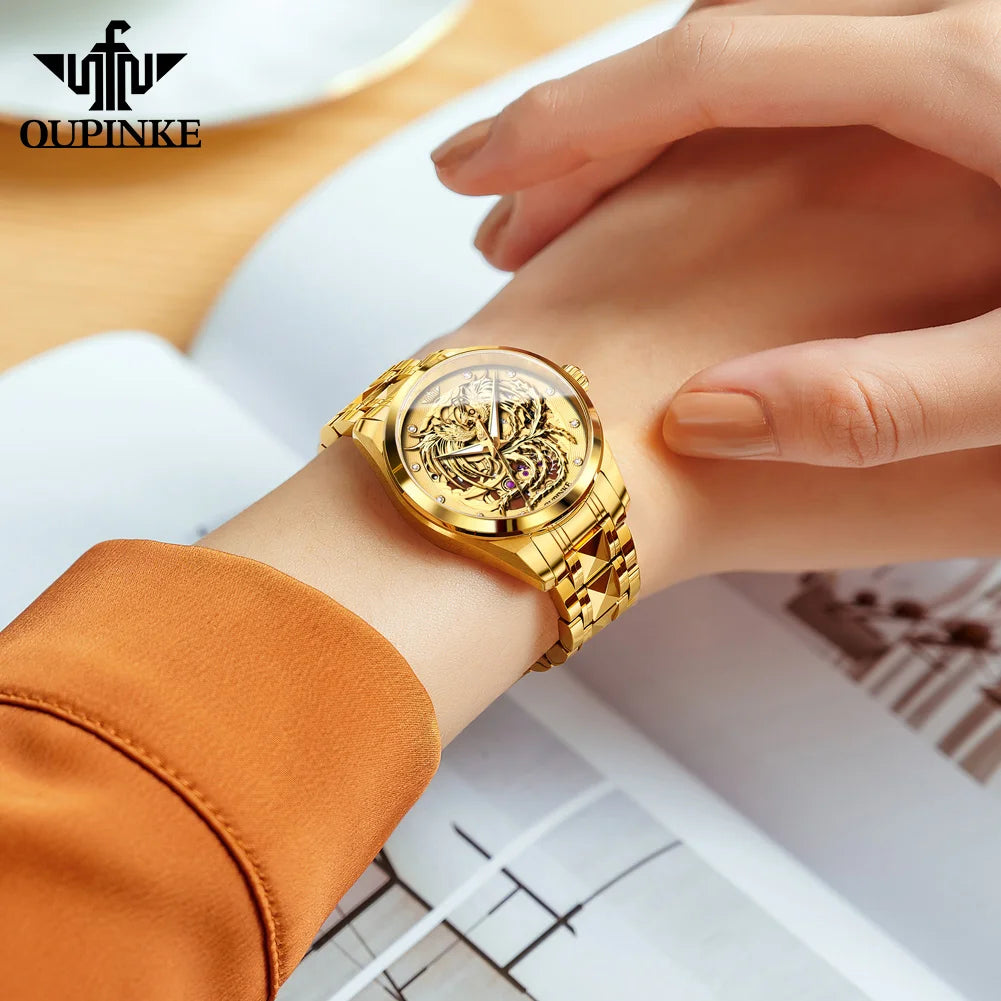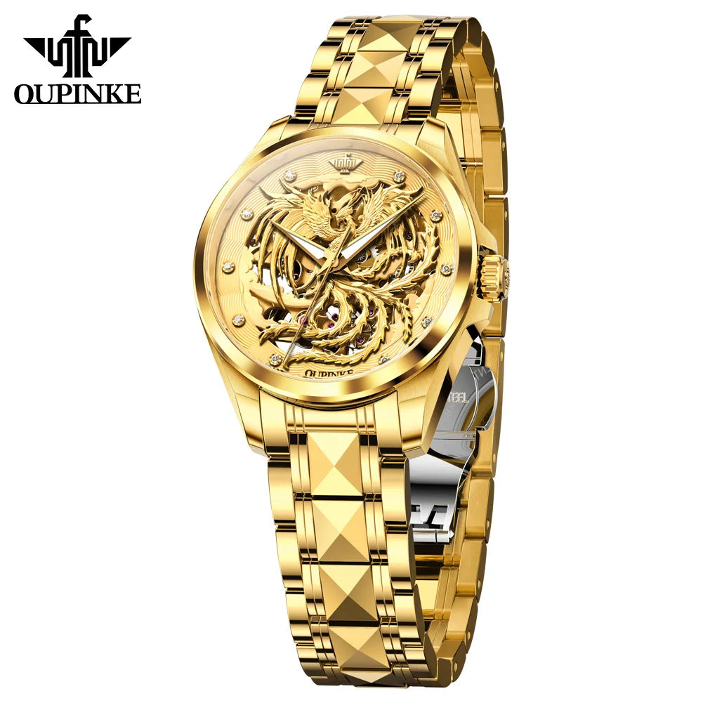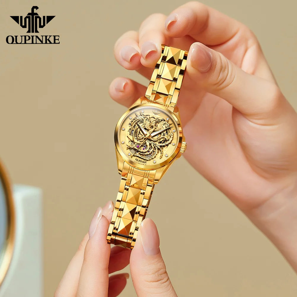 De OUPINKE 3276 is een luxe dameshorloge dat elegantie en vakmanschap samenbrengt. Met zijn gouden uitgeholde phoenix-ontwerp en hoogwaardige Japanse automatische beweging is dit horloge een verfijnde keuze voor vrouwen die stijl, klasse en kwaliteit waarderen.